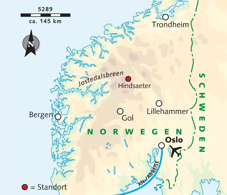 Hotel: Hindsaeter ist ein historisches Berghotel, ausgezeichnet als norwegisches Kulturerbe für eine vorbildhafte Renovierung und für die Vermittlung der Bergkultur. Ein moderner Wellnessbereich mit Whirlpool, Sauna und Infrarotsauna lädt zur Entspannung ein. Aufenthaltsräume und Kaminzimmer bieten einen großartigen Blick über das Tal und die Gipfel Jotunheimens. Das Restaurant ist original von 1898 und liebevoll mit Antiquitäten dekoriert. Direkt vom Hotel aus starten Schneeschuh-Pfade und einfach gespurte Skiloipen (ca. 50 km). Zimmer: Wenn du dich für ein Doppelzimmer entscheidest, wählst du bei Buchung zwischen der Unterbringung im Standardzimmer oder in der Almsuite. Die Standardzimmer (14 m², jeweils mit eigener Dusche/WC) sind rustikal und gemütlich mit viel Holz ausgestattet. Die Almsuiten (28 m², jeweils mit eigener Dusche/WC) sind mit historischen Bauernmöbeln und ganz viel Liebe zum Detail eingerichtet. Ein handgewebter Wandteppich, Slind (Überwurf für Betten) und eine alte Tür zum "Käselager" vermitteln authentische Almkultur. Eine Sitzgruppe mit warmen Fellen lädt zum Verweilen ein. Einzelzimmergäste wählen zwischen der Unterbringung im Standardzimmer (jeweils mit eigener Dusche/WC) und in der historischen Blockhütte, ca. 20 Meter oberhalb des Hotels gelegen. Hier befinden sich zwei Einzelzimmer (je ca. 20 m²) mit eigener Veranda nach Süden und Aussicht über das Tal. Gäste der Blockütte teilen sich ein gemeinsames Bad mit Dusche/WC mit eigenem Eingang. Verpflegung: Beim mehrfach ausgezeichneten Abendessen liegt der Schwerpunkt auf nordischer Küche, Nachhaltigkeit und Regionalität. Unsere Gastgeber erzählen gern von der Herkunft lokaler Spezialitäten. Vom Frühstücksbüfett stellen wir uns ein Lunchpaket für unterwegs zusammen. Lage: Hindsaeter liegt auf 900 m Höhe, knapp unterhalb der Baumgrenze, am Ostrand des Jotunheimen-Gebirges mit den höchsten Gipfeln Norwegens.