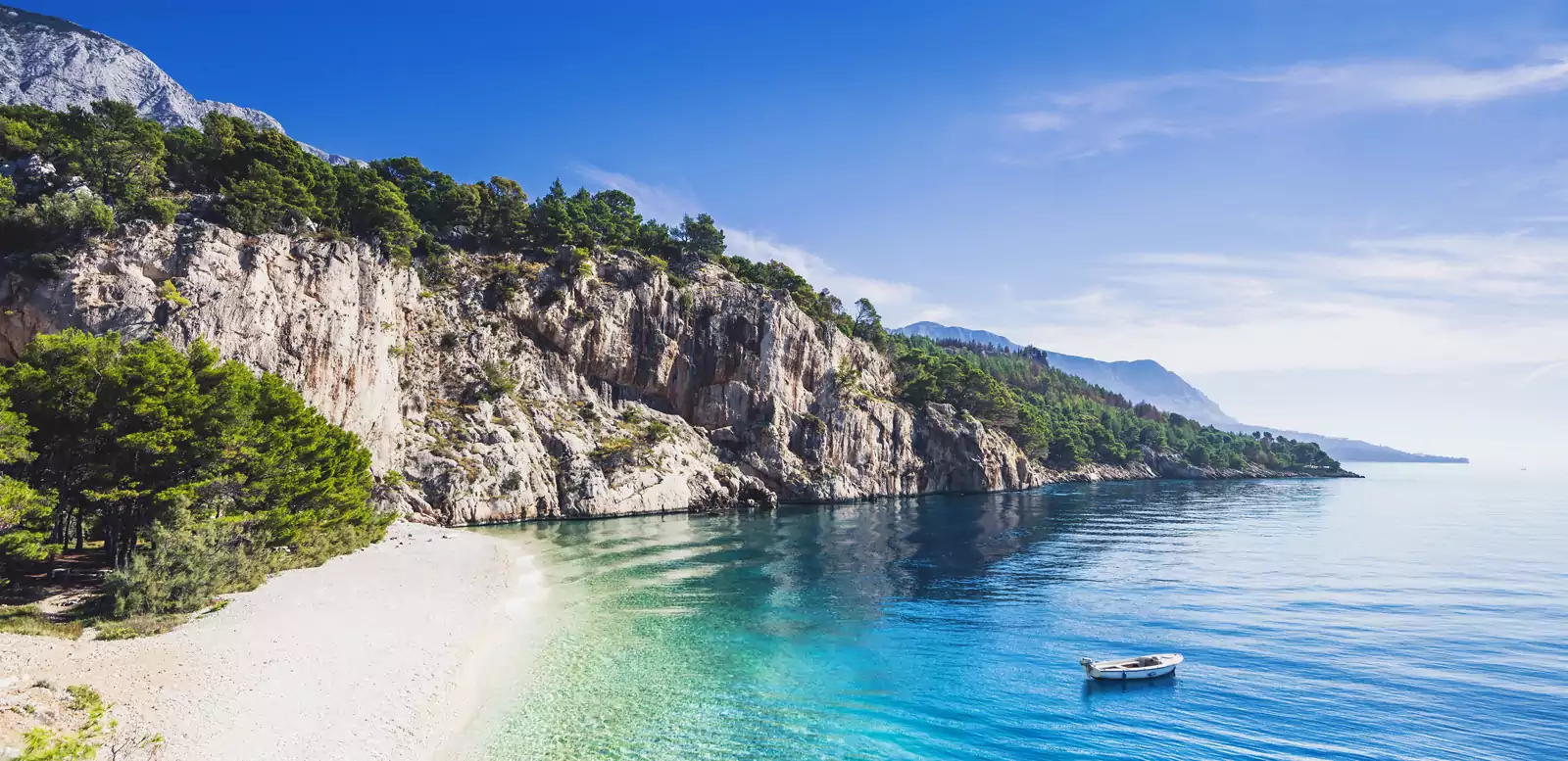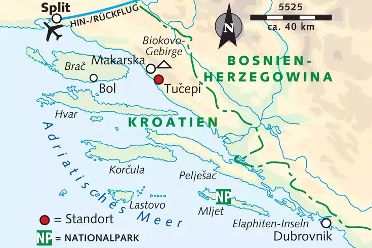 Südlich von Split liegt der schönste Küstenabschnitt Kroatiens – die Makarska Riviera am Fuß der mächtigen Felswände des Biokovo-Gebirges, das mit seinem höchsten Gipfel über 1.700 m aufragt. Davor liegen die langgestreckten Inseln, bekannt für ihre verschiedenen Kräuter- und Lavendeldüfte, im kristallklaren Wasser der Adria. Viele Pfade und alte Wege durchziehen die vielseitige Landschaft am Gebirgsfuß und die schroffen, fast senkrecht erscheinenden Felsabstürze der Berge, die Hochgebirgscharakter mit mediterranem Flair verbinden.