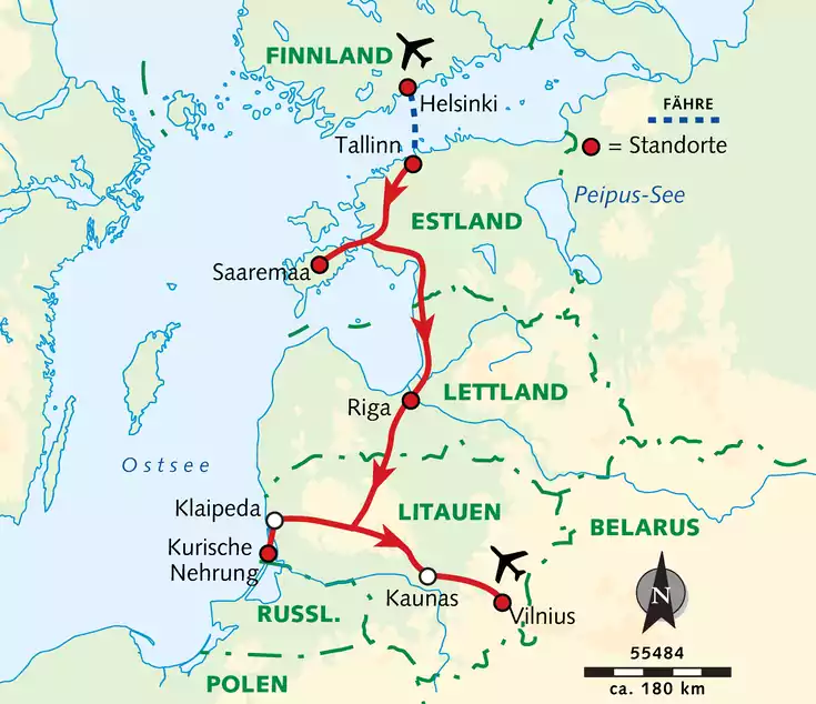 Begleite uns auf einer abwechslungsreichen Reise entlang der Ostsee. Wir starten in der quirligen finnischen Hauptstadt Helsinki. Gesäumt wird unsere Reise von kulturellen Höhepunkten in Hansestädten wie Tallinn und Riga und malerischen Schönheiten wie der Insel Saaremaa. Vorbei an Nida setzen wir unseren Weg bis nach Vilnius fort. Neben Saaremaa bietet uns auch die Kurische Nehrung einen schönen Kontrast zu unseren Städteerlebnissen mit weitläufigen Dünenlandschaften und weißen Sandstränden.