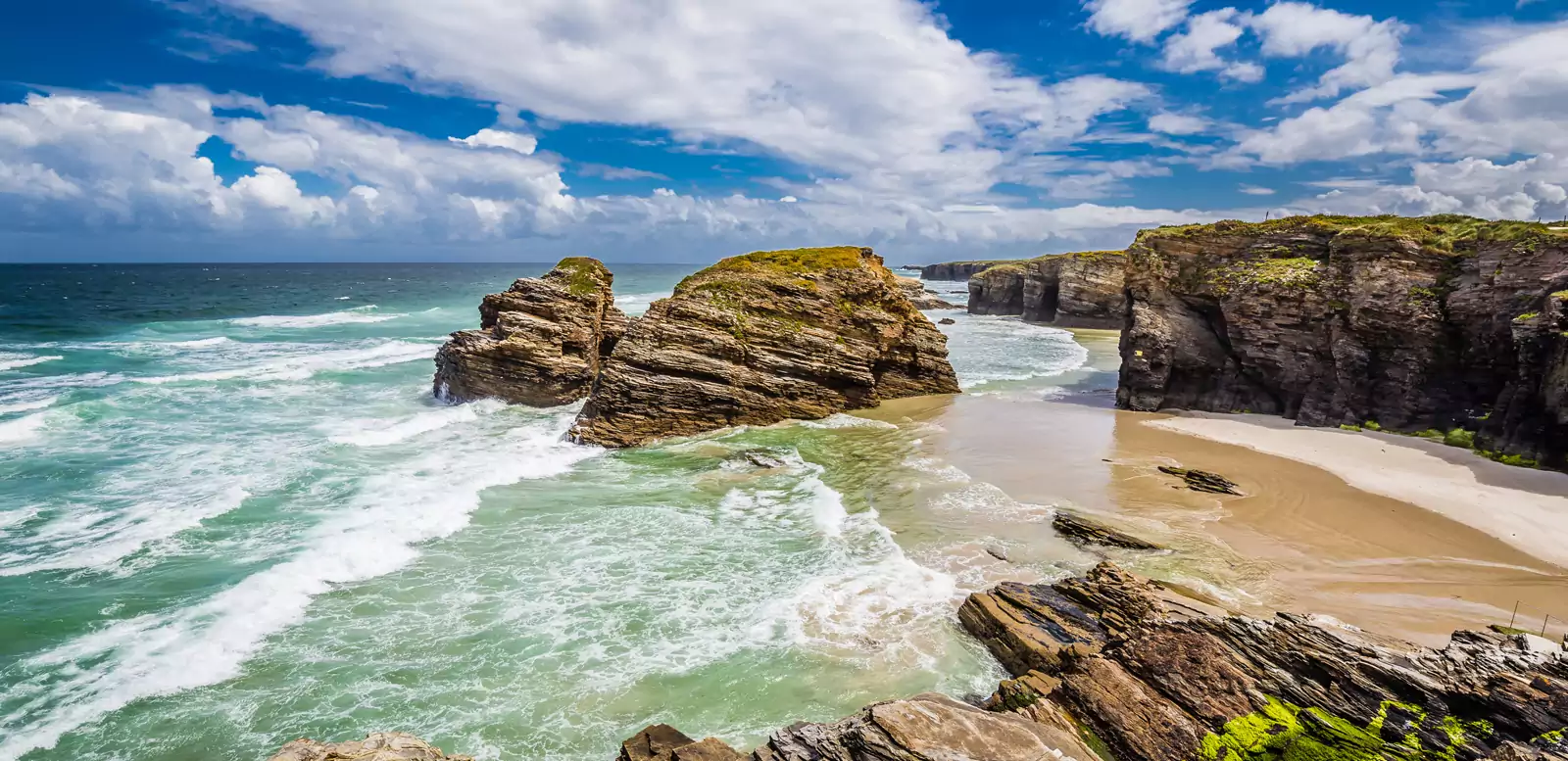 Wo der Atlantik unermüdlich gegen die Küste brandet, hat er über Jahrtausende eine spektakuläre Felslandschaft geschaffen: Am Kathedralenstrand türmen sich Bögen und Höhlen aus Stein zu bizarren Formationen, die an gotische Gewölbe erinnern. Je nach Gezeiten spazieren wir teils direkt über den feinsandigen Strand und lassen uns von der gewaltigen Kulisse aus Licht, Meer und Fels verzaubern. Ein einzigartiges Naturschauspiel, das in Erinnerung bleibt (GZ: 2 Std., kaum Höhenunterschiede).