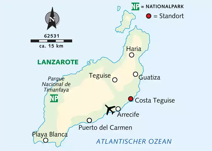 Hotel: Wir sind im Drei-Sterne-Hotel Siroco untergebracht, das sich mit einem "Adults only"-Konzept ausschließlich an erwachsene Gäste richtet. Die Unterkunft ist in einen Hauptbereich mit großem Außenpool und einen Nebenbereich mit modernen Premium-Apartments und separatem Pool unterteilt.Apartments: Die traditionell gestalteten Standard-Apartments befinden sich im Hauptbereich der Anlage und sind in je einen separaten Wohn- und Schlafraum aufgeteilt. Jedes Apartment ist mit TV, Mietsafe und Terrasse/Balkon mit Pool- oder Gartenblick ausgestattet. Die Reinigung der Apartments erfolgt 4 x pro Woche, davon 2 x mit Handtuchwechsel. Gegen Aufpreis sind modern eingerichtete Premium-Apartments buchbar. Verpflegung: Frühstück im Hotel. Die inkludierten Abendessen nehmen wir teils im Hotel und teils in auswärtigen Restaurants ein. Lage: Das Hotel befindet sich in ruhiger Lage am Ortsrand von Costa Teguise. Die Playa de las Cucharas sowie das Ortszentrum sind jeweils ca. 500 m entfernt.