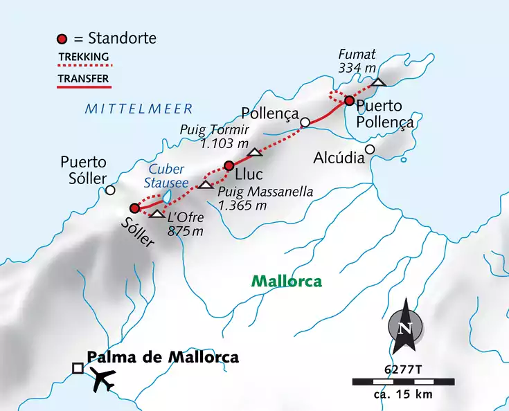 Unser Trekking beginnt in Sóller und führt uns bis nach Puerto Pollença. Die Tramuntana, die nicht umsonst zum UNESCO Welterbe ernannt wurde, begeistert uns mit sportlichen Touren und einmaligen Ausblicken. Wir passieren mit dem Puig Massanella und dem Puig Tomir die höchsten Erhebungen des Tramuntana Massivs, bis hin zum Cap Formentor. Begleite uns von den Bergen bis ans Meer!