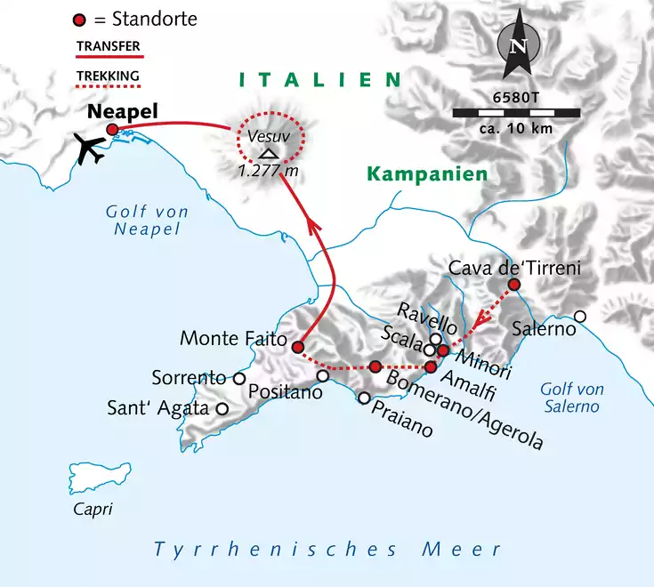Hoch über der Küste liegen stille Dörfer inmitten von Felsen und üppiger Vegetation, unten am Ufer finden sich mit Leben gefüllte Häfen und Gassen. Die Amalfiküste bietet eine Vielzahl an unterschiedlichen Landschaften. Wir wandern zwischen Zitronen- und Olivenhainen, über Terrassen, die über dem Meer zu schweben scheinen. Auf ausgedehnten Treppenwegen, auf dem Vesuv-Krater und auf manch einem Küstenpfad. Von den Bergen nähern wir uns immer wieder dem Meer. Ein einzigartiges Amalfi-Erlebnis auf etwas anderen Wegen mit herrlichen Panoramen.