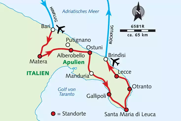 Über kleine Nebenstraßen und Feldwege radeln wir im Valle d´Itria durch hübsche Orte wie Noci und Putignano. Der Nachmittag steht zur freien Verfügung, um das urige Ambiente der Trulli-Viertel von Alberobello zu genießen. F