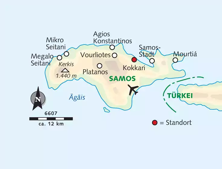 Die höchsten Berge, die grünsten Hänge, die dichtesten Wälder – willkommen im Norden von Samos! Atmen wir den Duft von Pinien, lassen wir den Blick schweifen über Berggipfel und das türkisblaue Meer. Kleine Bergdörfer laden mit verwinkelten Gassen und urigen Tavernen zum Bummeln und Ausruhen ein. Herrliche, von steilen Klippen eingerahmte Buchten locken zu einem erfrischenden Bad. Seele baumeln lassen, bei griechischer Ruhe und Gelassenheit entspannen, Ausblicke genießen, die Zeit vergessen. Was willst du mehr?