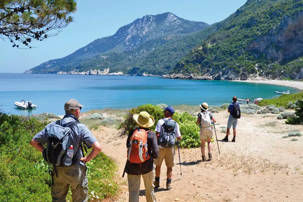 Durch dschungelartige Vegetation verläuft unser Weg durch eine Schlucht hinauf zum Dorf Tsourlei. Der Waldpfad endet beim Dorf Nikoloudes, bevor es immer bergab geht mit wunderbaren Blicken über die Nordwestküste, die wir schließlich bei den beiden traumhaften Buchten Megalo und Mikro Seitani erreichen (GZ: 5 Std., +/- 450 m).