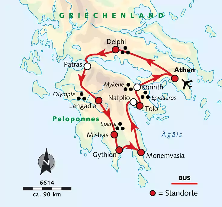 „Der“ oder „die" Peloponnes? Hier streiten sich die Gelehrten. Sicher ist jedoch, dass sich auf der Insel des Pelops ein kultureller Höhepunkt an den anderen reiht, eingebettet in atemberaubende Landschaften. Reisen wir in die Antike nach Olympia, Mykene und Epidauros sowie ins Mittelalter nach Mistras und Monemvasia! Mythen und Legenden gibt es an allen Orten reichlich. Und natürlich sagen wir Griechenland nicht „Adio", ohne auf dem Festland die Akropolis und Delphi gesehen zu haben.