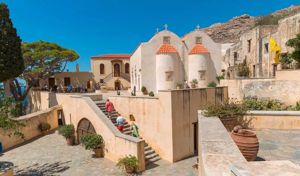 Unsere Wanderung beginnt an der alten Brücke bei Preveli, führt am Ufer des Megalopotamos-Flusses entlang und hinauf zu einer Anhöhe. Sie bietet ein beeindruckendes Panorama auf die Küste und den Palmenhain (GZ: 3 1/2 Std., + 250 m). Hier ist Gelegenheit zum Baden. Nach der Mittagspause besuchen wir das alte Kloster von Preveli aus dem 17. Jh., das etwa 150 m hoch über der Felsküste liegt.