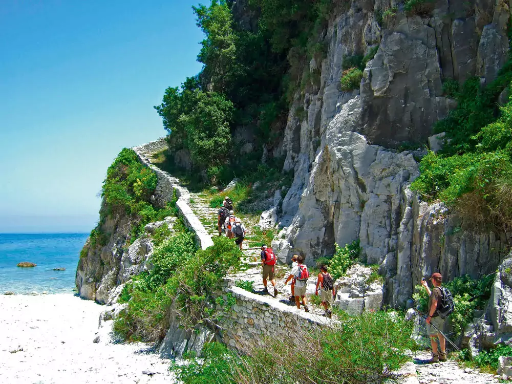 Einfach sind die Wanderungen im zerfurchten Pilion-Massiv nicht: Zu steil ist das Gelände, zu steinig sind die Wege und Pfade, zu groß sind die Höhenunterschiede. Dafür bieten sie alles, wovon der Griechenland-Wanderer träumt: alte Pflasterwege, schattige Aufstiege im Laubwald, traumhafte Ausblicke, Dörfer mit herausgeputzten Platias. Von den sieben Wanderungen mit Gehzeiten von vier bis fünf Stunden und Aufstiegen zwischen 200 und 600 m sowie Abstiegen von 400 bis 1.200 m enden fast alle direkt am Meer an einem der herrlichen Badestrände. An den freien Tagen gibt es verschiedenste fakultative Möglichkeiten: Wanderungen zum Strand von Milopotamos und nach Agii Saranda. Eine halbtägige Bootsfahrt entlang der Küste. Ausflug nach Volos mit Stadtbummel und Besuch des Archäologischen Museums und der Ausgrabungen oder eine geführte See-Kajak-Tour.