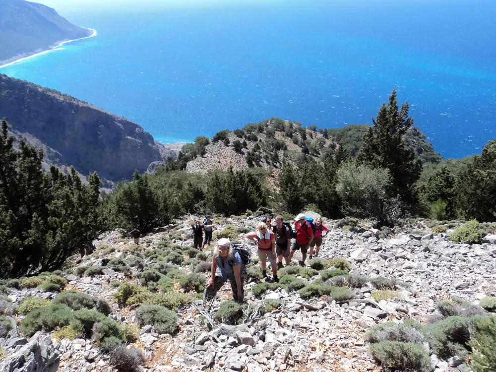 Von Agia Roumeli aus besteigen wir den 980 m hohen Papouras (Abkürzung möglich). Er ist ein Aussichtspunkt mit Panoramablick auf die höchsten Gipfel Pachnes und Melindaou (GZ: 5 Std., +/- 1.000 m).
