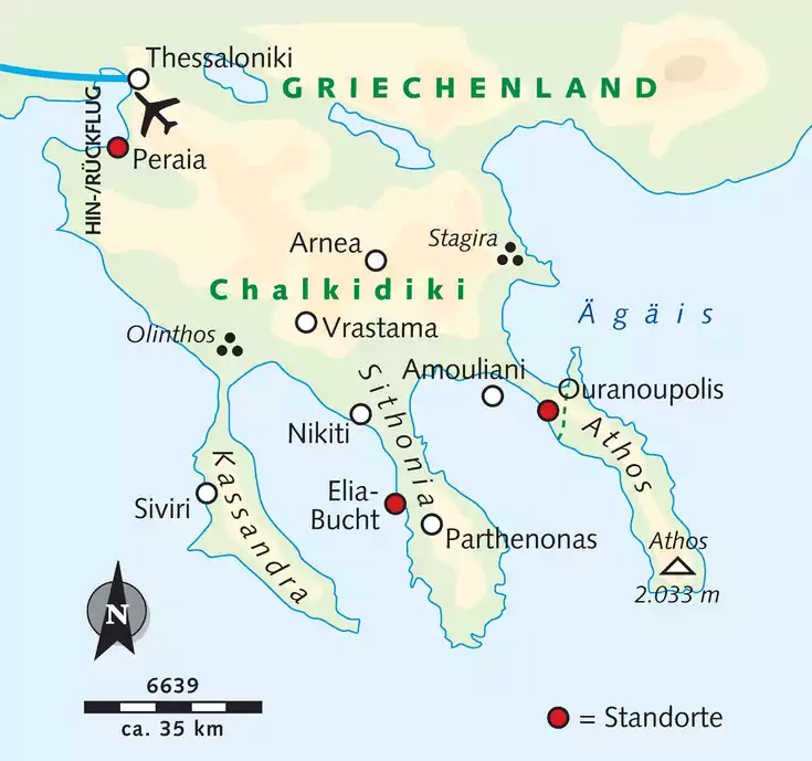 In Nordgriechenland bilden drei Halbinseln mit dem Hinterland den "Dreizack Poseidons". Er bezaubert mit Bergdörfern, Ausgrabungsstätten, dem Holomondas-Gebirge und goldgelben Stränden. Der Mönchsrepublik Athos entlocken wir bei einer Bootsfahrt manche Geheimnisse. Die Höhen bei Ouranoupolis und auf Sithonia belohnen den Wanderer. Die Insel Amouliani ist ebenso Ziel eines Ausfluges wie die Halbinsel Kassandra. Dort erwarten uns zwei der schönsten Dörfer Chalkidikis.