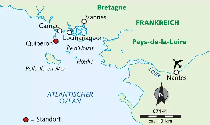 Flug nach Nantes oder Brest und Transfer zu unserem Hotel auf der Halbinsel Quiberon. Je nach Ankunftszeit bleibt vielleicht noch Zeit für ein erstes Bad im Atlantik oder einen Spaziergang zum nahe gelegenen Port-Haliguen.