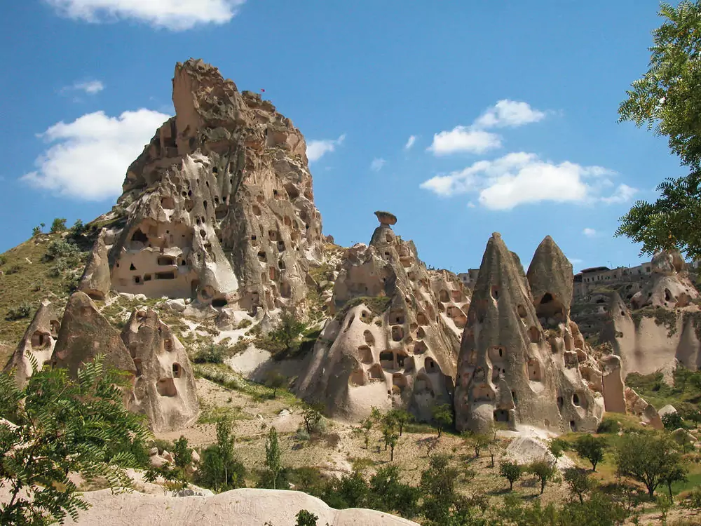 Am Morgen besteigen wir über Innen- und Außentreppen den 60 m hohen Felsenkegel von Uçhisar. Unsere Wanderung im zauberhaften Tal der Tauben endet im Freilichtmuseum von Göreme (UNESCO-Weltkulturerbe). Wir besichtigen die in Tuffstein gehauenen Kirchen aus byzantinischer Zeit (GZ: 3 Std., - 120 m). Sie sind teils reich mit Malereien verziert und umringt von Feenkaminen.