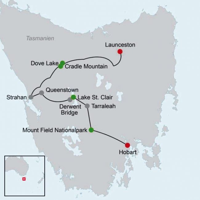 - Auch buchbar als vollständige Strecke "Tasmanien für Genießer" ab/bis Hobart (9 Tage/8 Nächte), Termine: freitags: 16.10., 30.10., 13.11., 27.11., 11.12., 8.1., 22.1., 5.2., 19.2., 5.3., 19.3.: Anf R, Leistung HBA22007B (UG1X)