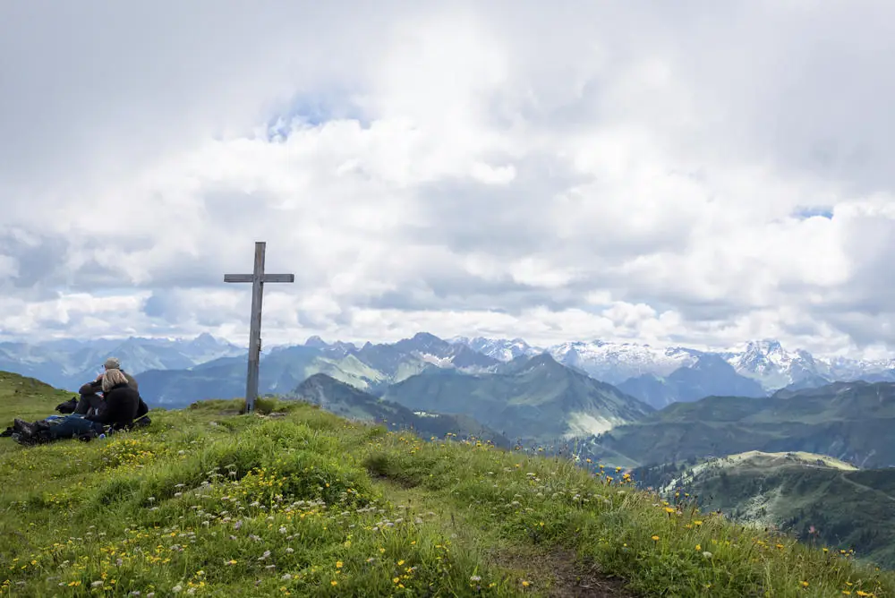 Fahrt mit dem Uga-Sessellift. Von der Bergstation des Damülser Lifts wandern wir in einem großen Bogen über einen breiten Grat und können dabei Gipfel über 2.000 m erobern. Bei gutem Wetter hat man Ausblicke bis zum Bodensee, in die Schweiz und auf die Felsmassive des Großen Walsertals (GZ: 4 Std., + 400 m, - 700 m).