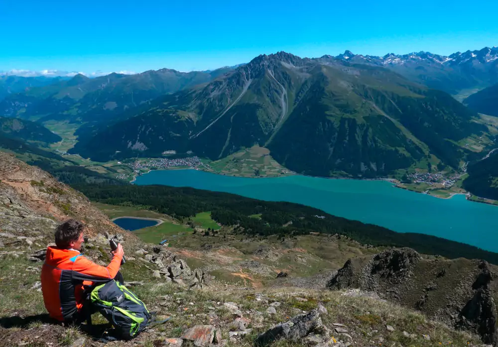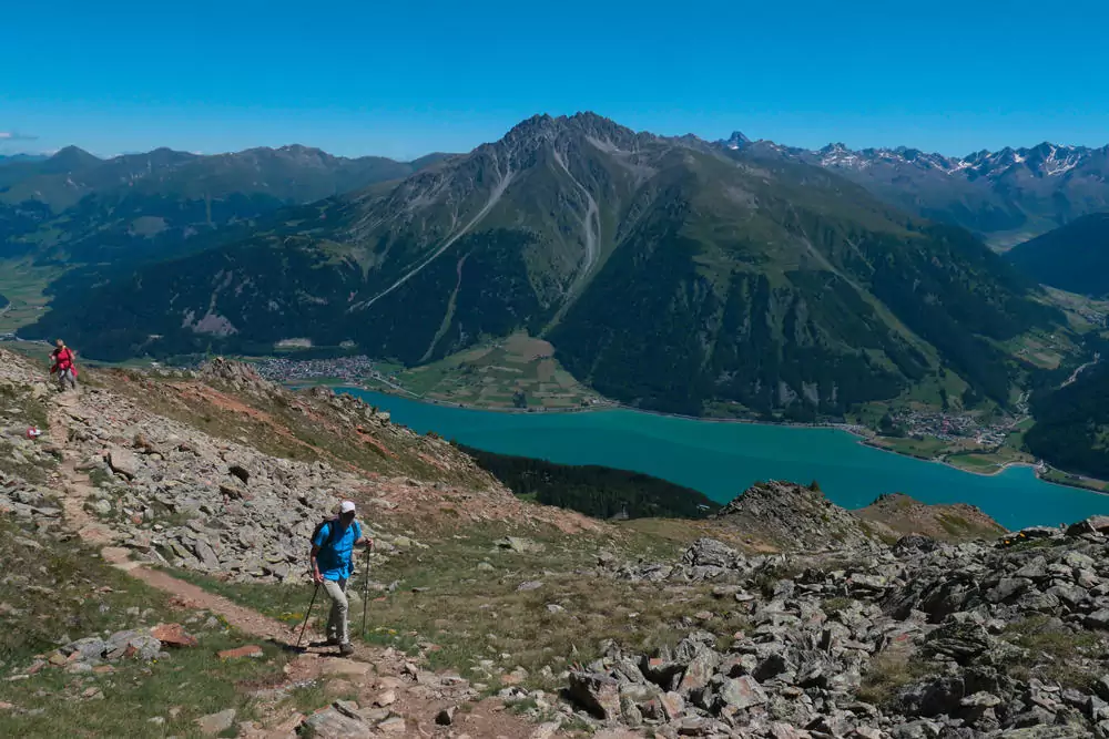 Österreich/Italien: Mit der Bergkastelseilbahn schweben wir zur Bergstation und wandern auf dem Panoramaweg durch alte Zirbenwälder mit Blicken auf das Grenzgebirge zur Schweiz. Doch die schönste Aussicht erwartet uns am Plamort-Felsen: Im Vordergrund breitet sich der Reschensee aus, im Hintergrund malen sich die Gipfel des Ortlers, der Königsspitze und des Monte Cevedale in den Himmel, herrlich! Abstieg nach Graun und Transfer nach Nauders (GZ: 3 Std., + 50 m, - 700 m). Wer den Abstieg umgehen möchte, kann nach einer Rundwanderung über neu angelegte Pfade mit der Bahn hinabfahren (fakultativ).