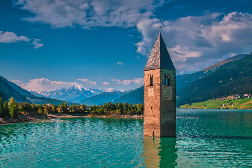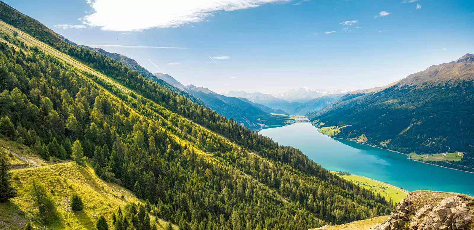 Italien: Wir fahren nach St. Valentin und nehmen die Bergbahn hinauf zur Haideralm. Ein wunderschön angelegter Panoramaweg bietet tolle Blicke auf den Reschensee. Wer noch höher hinaus möchte, steigt auf den Zehnerkopf (fakultativ). Die Ötztaler Gletscherriesen mit der Weißkugel (3.738 m) und der Weißseespitze (3.498 m) glitzern in der Sonne – was für ein Anblick! Mit der Schönebenbahn geht es hinab ins Tal (GZ: 4 1/2 Std., + 450 m, - 500 m).