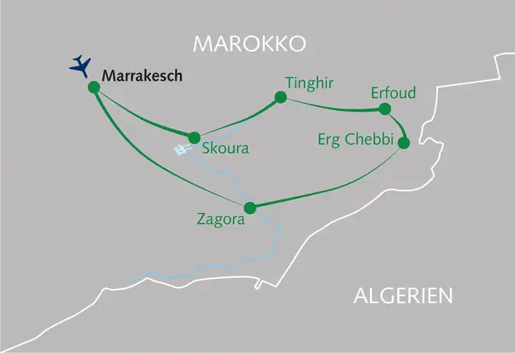 Nach dem Frühstück fahren wir in Richtung Süden in die kleine Stadt Agdz, die den Beginn des beeindruckenden Draa-Tals markiert. Die üppig bewirtschafteten Felder unter den Dattelpalmen sind von befestigten Kasbahs und Ksours umgeben. Diese Gebäude zeugen vom Wohlstand des Draa-Tals durch den Karawanenhandel. Am Nachmittag unternehmen wir eine Wanderung in der Palmeraie von Tamnougalte. GZ ca. 2 Std. Hotelübernachtung in Agdz. 260 km. (F, A)