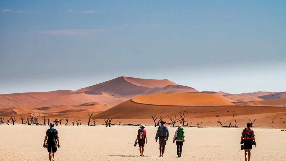 Frühmorgens fahren wir zu den Dünen des Sossusvlei. Mit einer Höhe von bis zu 300 Metern gehören sie zu den höchsten der Welt. Die Bäume in der weißen Senke des Deadvlei ragen gen Himmel. GZ ca. 3 Std. Nach unserem Besuch im Sesriem-Canyon (GZ ca. 2 Std) fahren wir zurück zur Lodge. (F, M, A)