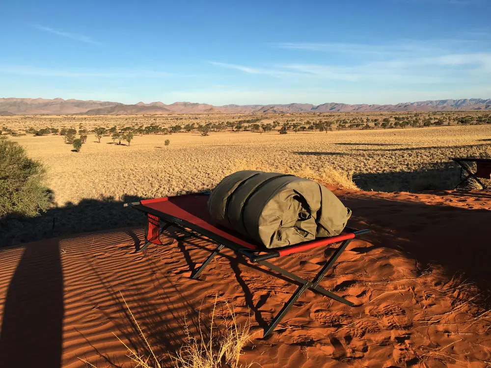 - 8 Übernachtungen in Mittelklasselodges/-hotels im Doppelzimmer mit Bad oder Dusche/WC, 1 Übernachtung im Dünencamp mit Feldbetten und Schlafrollen (komfortable Schlafsäcke mit integrierter Schlafmatte) ohne sanitäre Einrichtungen