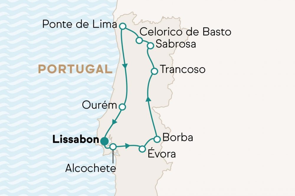 14 Übernachtungen/Frühstück: 2x Quinta da Praia das Fontes, Alcochete; 2x Quinta das Lavandas, Castelo de Vide; 2x Solar Sampaio e Melo, Trancoso; 2x Quinta da Veiga, Sabrosa; 2x Casa de Canedo, Celorico de Basto; 2x Paço de Calheiros, Ponte de Lima; 2x Quinta da Alcaidaria Mor, Ourém