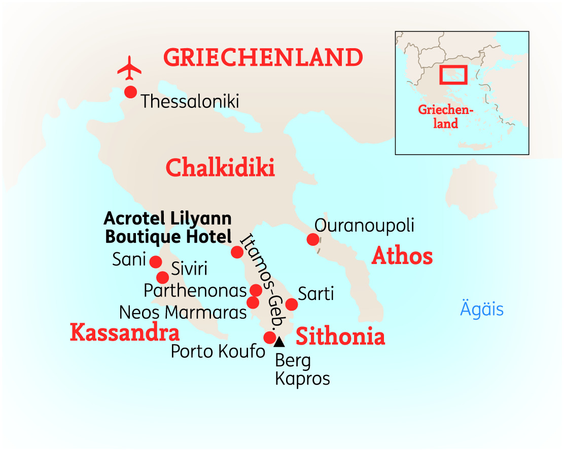 Chalkidiki liegt im Norden Griechenlands und erstreckt sich über die Halbinseln Kassandra, Sithonia und Athos, die wie drei Finger in die Ägäis ragen. Pinienwälder reichen bis an das azurblaue Meer. Einsame Buchten, lange Strände und idyllische Dörfer bilden dazu einen Kontrast. Urige Tavernen an kleinen Fischerhäfen laden zu leckeren Spezialitäten ein. Entdecken Sie auf dieser 8-tägigen Reise eine Region Griechenlands, die ihre Ursprünglichkeit noch weitgehend bewahrt hat.