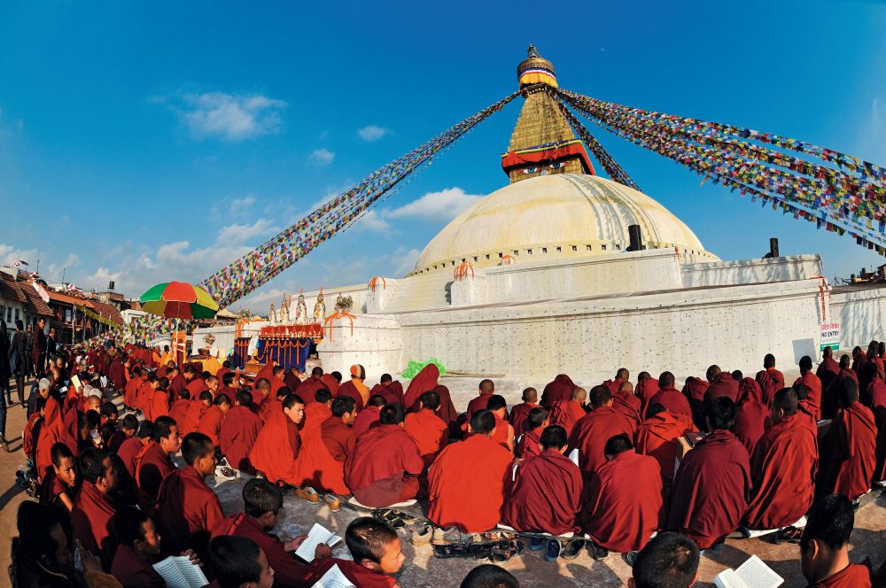 Freuen Sie sich auf weitere UNESCO Weltkulturerbestätten des Kathmandu-Tals. Stehen Sie in Bodnath vor der 40 Meter hohen buddhistischen Stupa und beobachten Sie andächtig die Gläubigen, die die Stupa umrunden und dabei das Gebet „Om mani padme hum“ murmeln. In einem nahe gelegenen Kloster erwartet Sie eine Audienz bei einem Mönch. Interessantes über die religiöse und spirituelle Fertigkeit des Malens von Thankas und Mandalas erfahren Sie beim Besuch einer Akademie für Künste. Eine ganz andere Welt erwartet Sie in Pashupatinath. Das bedeutendste hinduistische Shiva-Heiligtum und Verbrennungsstätte in Nepal ist Ziel zahlreicher Pilger und Sadhus. (F)