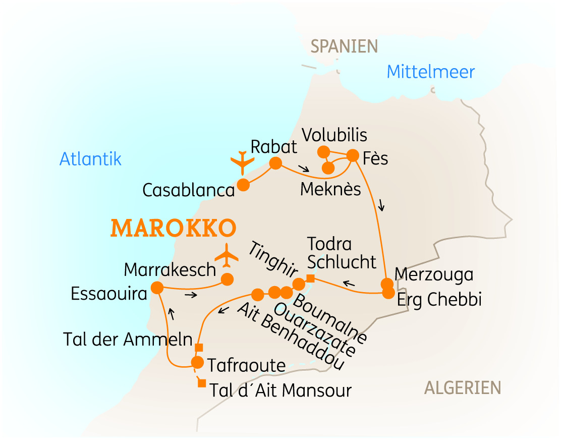 Ort / Unterkunft / Kategorie* / Nächte (Änderungen vorbehalten) Casablanca / Odyssee Center Hotel / **** / 1 Fès / Rayhana/ Riad / 3 Merzouga / Ksar Merzouga /*** / 1 Merzouga/Bouchedor /Wüstencamp / 1 Ouarzazate /Dar Chamaa / Riad / 2 Tafraoute /Chez Amaliya / *** / 2 Essaouira / Maison du Sud / Riad / 2 Marrakesch /Milouda / Riad / 2 * Landeskategorie