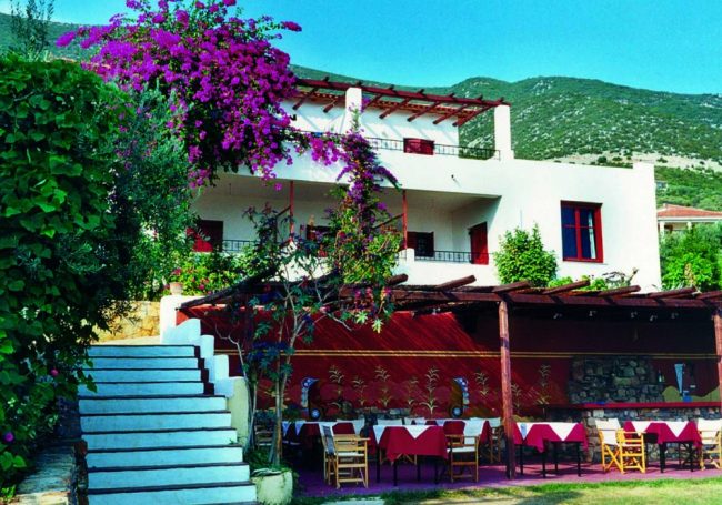 liegt drei Kilometer außerhalb von Palea Epidaurus mit Blick auf den Saronischen Golf. In einer gepflegten Gartenanlage befinden sich 18 Studios. Die ca. 35 Quadratmeter großen Zimmer verfügen über zwei Betten, Dusche/WC, eine Küchenecke mit Herd und Kühlschrank, eine Klimaanlage sowie Balkon oder Terrasse, z.T. mit Meerblick. Diese typische SKR-Unterkunft wird von einer griechischen Familie inpersönlichem Stil geführt. Ein kleiner Fußweg von ca. 300 Metern führt durch den hoteleigenen Orangenhain zu Ihrem kilometerlangen Kieselstrand. Im Hain lädt ein gemütlicher Schattenplatz zum Verweilen ein. Verpflegung: Im Preis enthalten ist Halbpension. Mutter Heleni bereitet das reichhaltige Frühstücksbuffet und ihre typischen Spezialitäten zum Abendessen zu. Der hauseigene Orangenhain liefert Ihnen frisch gepressten Saft.