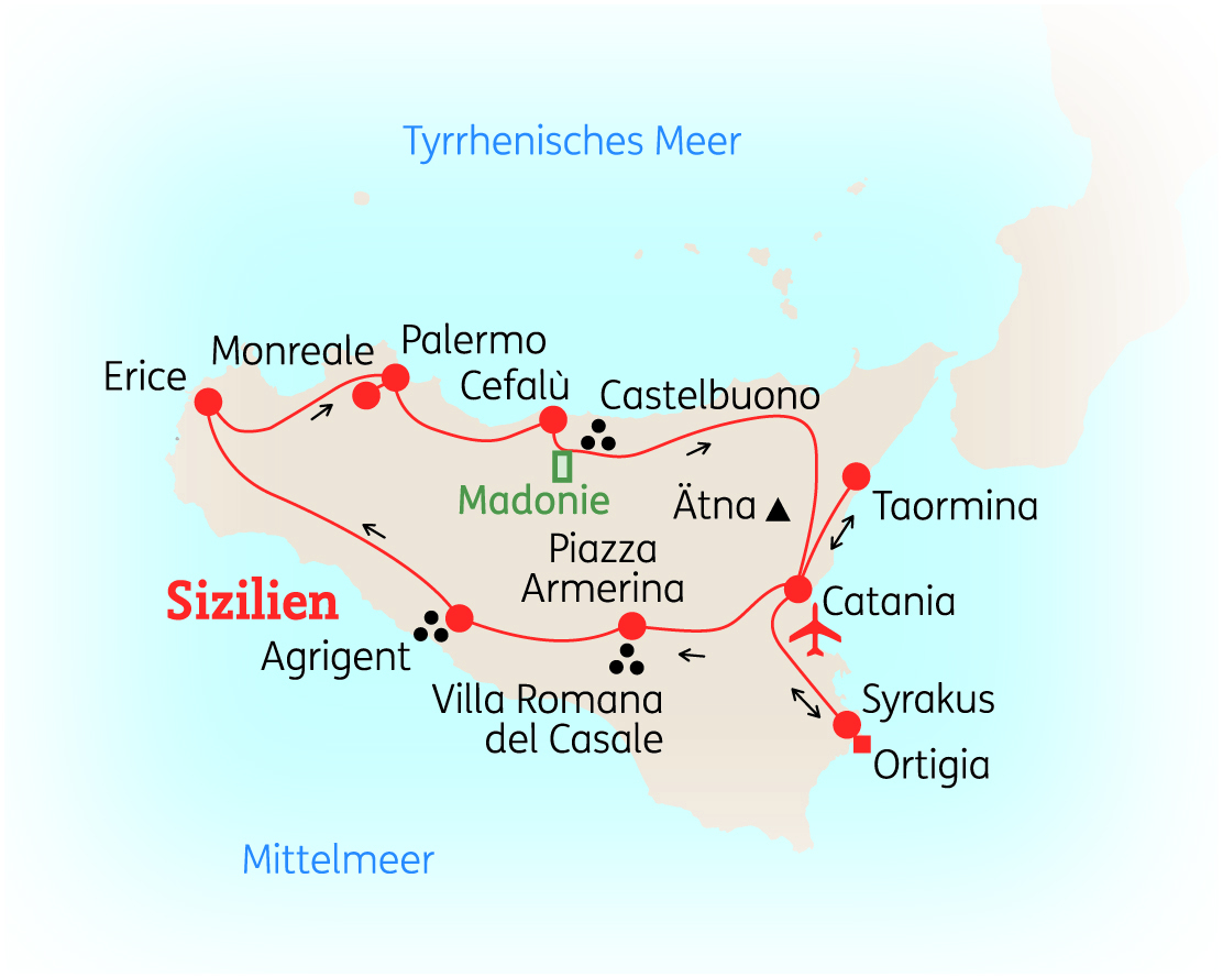 Sizilien will entdeckt werden: griechische Tempel wie die Ausgrabungsstätten in Agrigent, römische Baukunst wie das Glanzstück der Spätantike Villa Romana del Casale oder arabische Einflüsse in den Kuppelbauten von Palermo. Erleben Sie auf Ihrer 8-tägigen Rundreise die Highlights sowie die Vielfalt der Insel mit rauen Vulkan- und Berglandschaften, quirligen Metropolen, idyllischen Barockstädtchen und kulinarischen Besonderheiten. Die Insel zieht mit ihrer Vielfalt jeden Besucher in ihren Bann!