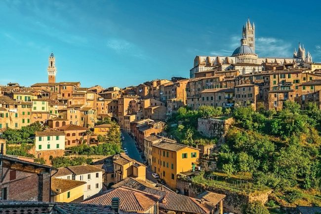 Seit jeher die Rivalin von Florenz, gilt Siena als eine der schönsten Städte Italiens. Im Gegensatz zur florentinischen Renaissance finden Sie hier mittelalterliche Gotik in der historischen Altstadt. Vorbei an der mächtigen Kirche San Domenico und an beeindruckenden Palästen erreichen Sie den eindrucksvollen Dom, der die ganze Stadt überragt. Überwältigend ist der Innenbereich, in dem Sie staunend über einen Teppich aus Mosaiken und Intarsien laufen. Die typischen braun-roten Siena-Steine auf der berühmten Piazza del Campo werden von der Sonne angenehm gewärmt und laden zum Verweilen ein. Gönnen Sie sich eine Pause und genießen Sie den Blick auf den außergewöhnlich schwarz-weiß gestreiften Glockenturm.(F)