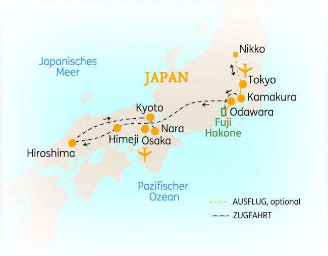 Bei dieser Rundreise nutzen Sie vorwiegend die öffentlichen Verkehrsmittel Japans. Dies gibt Ihnen die Gelegenheit, den Alltag der Japaner noch besser kennenzulernen. Da es in Japan, anders als in Deutschland, nicht üblich ist, in Schnellzügen große Reisegepäckstücke mitzuführen, wird Ihr Gepäck an Reisetagen mit langen Shinkansen-Fahrten durch einen Zustellservice separat zu Ihrer Unterkunft des Folgetages verschickt. Bitte beachten Sie, dass die längeren Fahrtstrecken trotz des Komforts der Schnellzüge körperlich anstrengend sein können. Daher entlastet Sie die Zustellung des Gepäcks zusätzlich von der Mitnahme des schweren Gepäcks. Dadurch steht Ihnen an diesen Tagen Ihr Hauptgepäck nicht zur Verfügung. Darüber hinaus wird Ihr Gepäck bei Ihrer Übernachtung in einer traditionellen Familienpension im Reisebus gelagert. Wir empfehlen Ihnen ein praktisches Handgepäckstück, wie zum Beispiel einen kleinen Rucksack, mit den für die Nacht und darauffolgenden Tag benötigten Utensilien zu packen (Kleidung, Regenschirm, Badeutensilien). Dies betrifft Ihre Übernachtung im Fuji-Hakone Nationalpark (Tag 5).