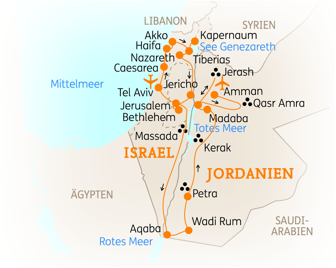 - deutschsprachige, örtliche Reiseleitung; Transfer zur israelisch-jordanischen Grenze und weiter nach Aqaba mit englischsprachigem Fahrer (Tag 7); palästinensischer Guide in Bethlehem