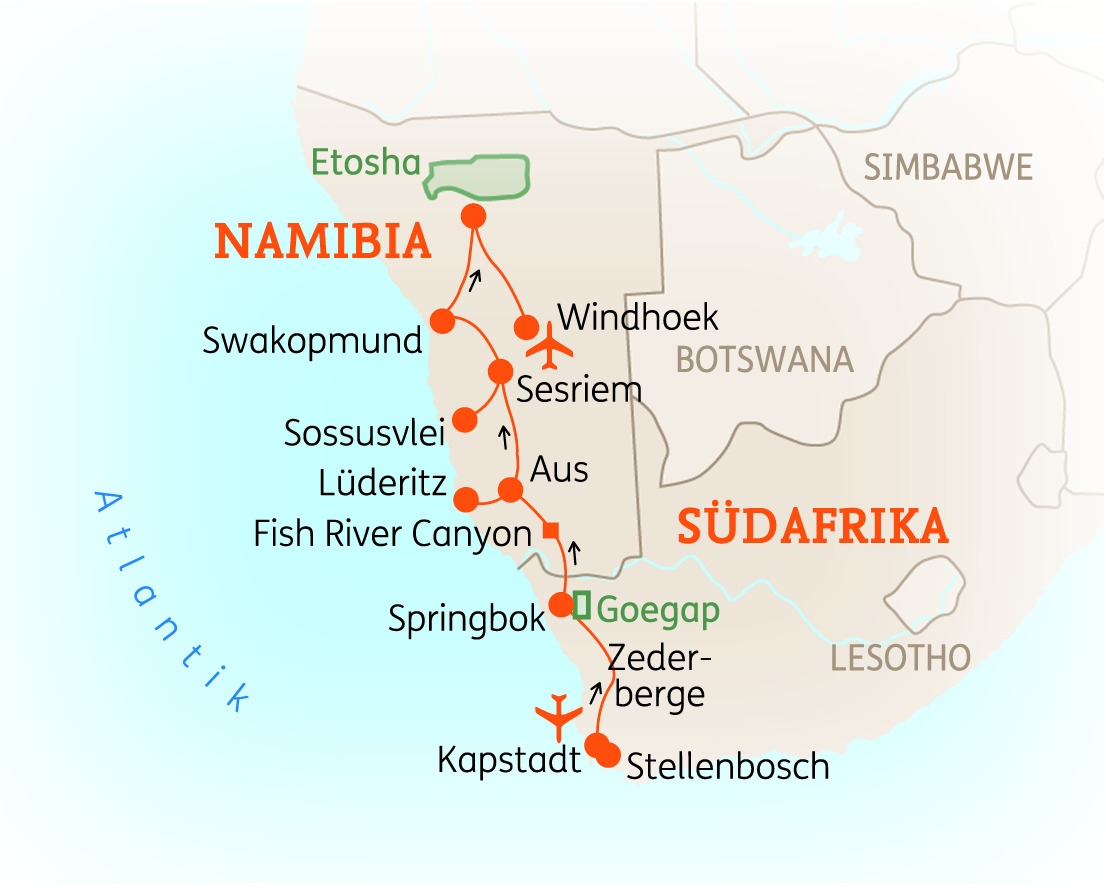 Der dargestellte Reiseverlauf entspricht den Terminen mit dem Reisekürzel ZARWES (von Kapstadt nach Windhoek). Detaillierte Informationen zum Reiseverlauf für die Termine mit dem Reisekürzel ZARWEW (von Windhoek nach Kapstadt) erhalten Sie im Reisebüro.