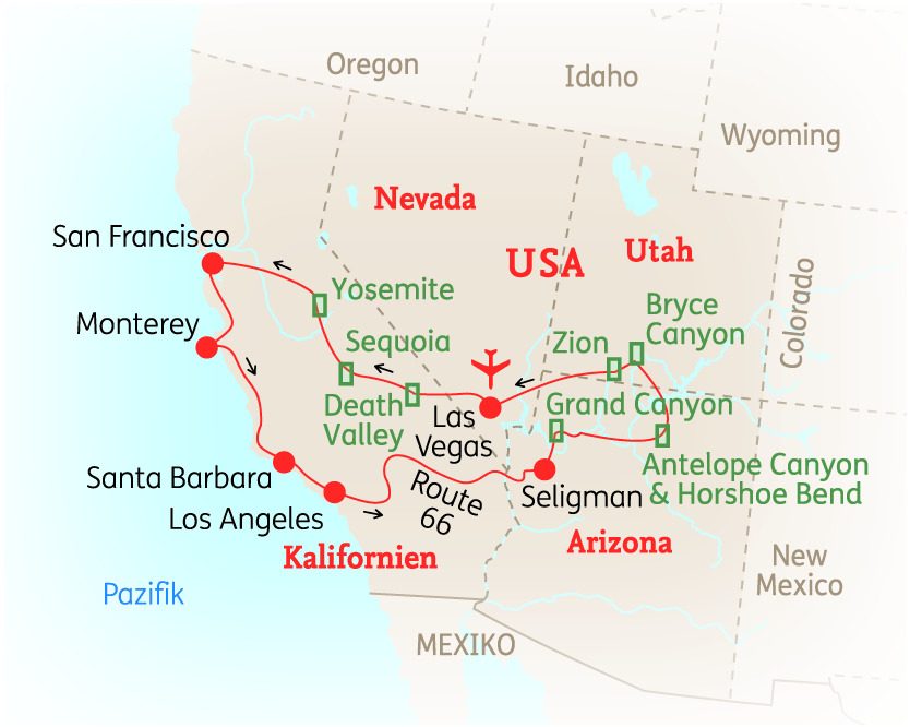 USA -Der Westen der USA weiß seine Besucher zu begeistern: Lassen Sie den unverwechselbaren Kontrast zwischen Pazifikküste, Wüste, Bergen und Metropolen auf sich wirken und tauchen Sie ein in den American Way of Life. Ob im charmanten San Francisco, unterwegs auf der Route 66 oder vor den riesigen Schluchten des Grand Canyon – eine ausgewogene Mischung aus Stadt und Natur gibt Ihnen auf Ihrer 16-tägigen Rundreise einen umfassenden Eindruck des Golden State und des Südwestens der USA.