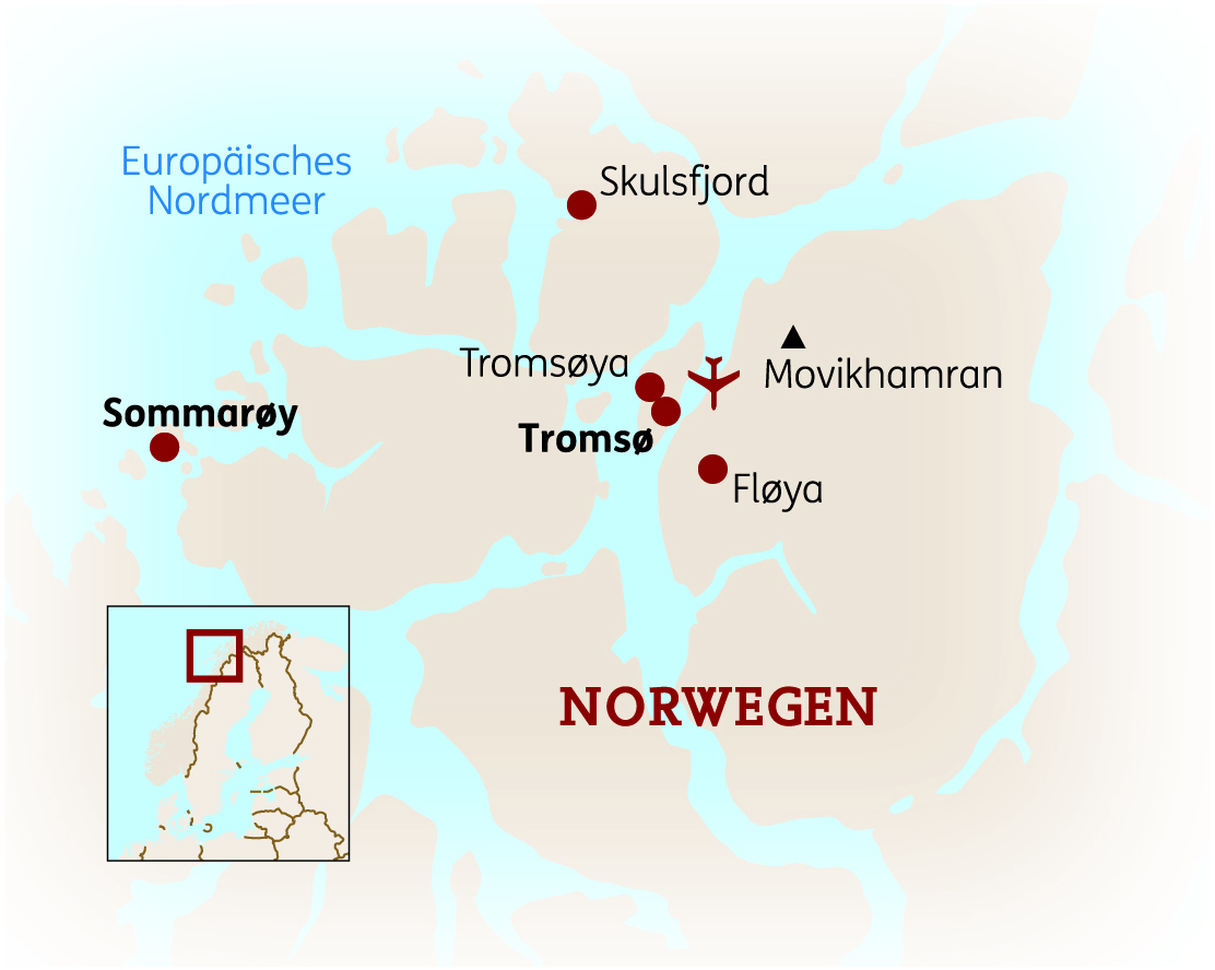 Ort / Unterkunft / Kategorie* / Nächte Tromsø / Thon Hotel Polar / *** / 5 Sommerøy / Arctic Hotel / **** / 2 *Landeskategorie / Änderungen vorbehalten