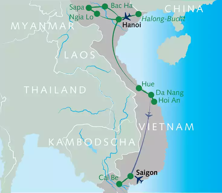 Du möchtest neben Vietnams klassischen Höhepunkten auch die grüne Bergwelt des Nordens intensiv und aktiv kennenlernen? Dann ist diese Reise genau die Richtige für dich! In der Bergwelt von Bac Ha begeistert uns insbesondere die Natur und die Begegnungen mit traditionellen Bergvölkern. Wir entdecken die Kulturmetropole Saigon, schlendern durch das koloniale Hoi An und erobern die quirlige Hauptstadt Hanoi. Die Halong-Bucht rundet unsere Reise ab. Sei dabei!