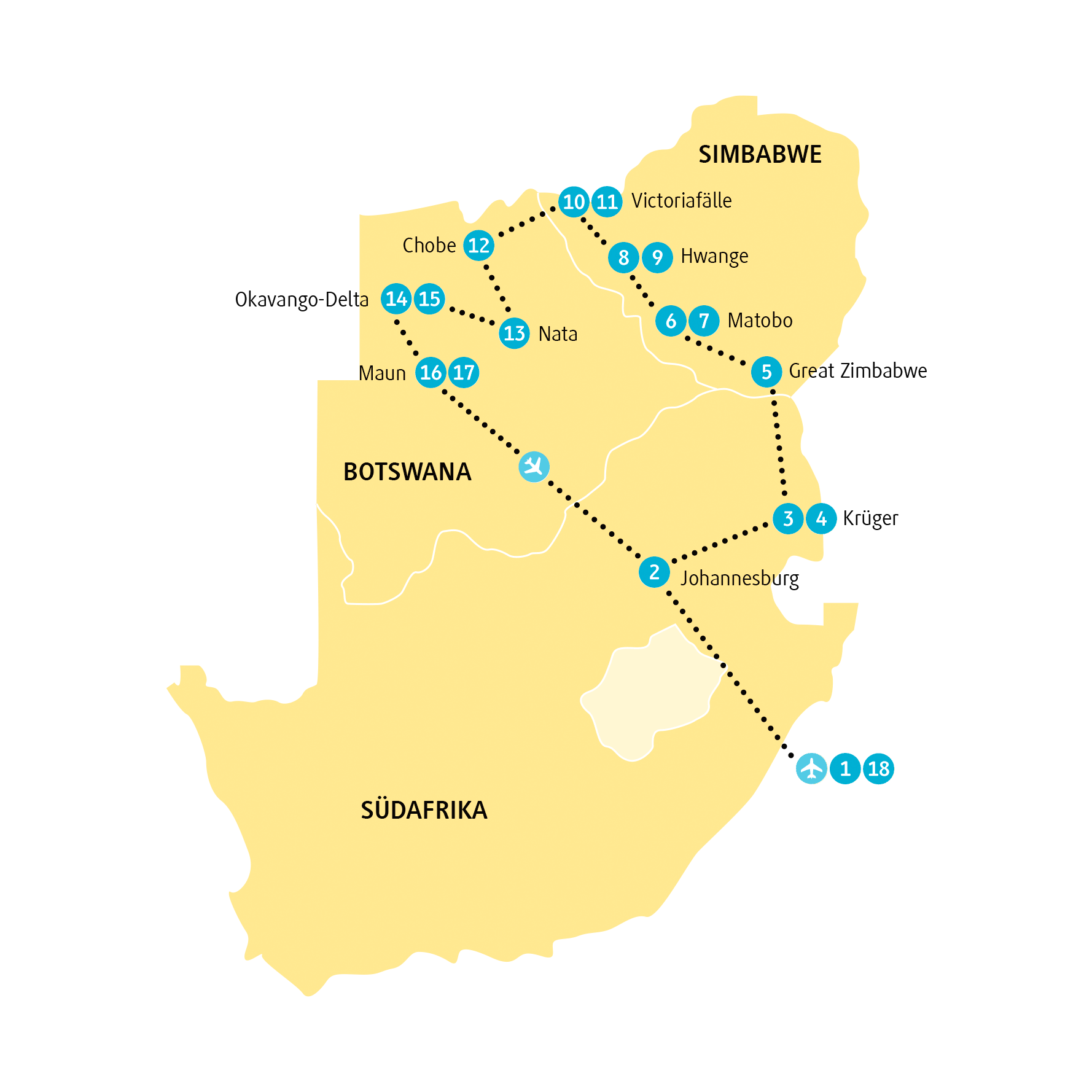 Nach über zwei ereignisreichen Wochen endet unsere Reise heute und wir fliegen von Maun über Johannesburg zurück nach Europa. Lass die vorbeiziehende Szenerie ein letztes Mal auf dich wirken, bevor du in die Maschine in Richtung Heimat steigst.
