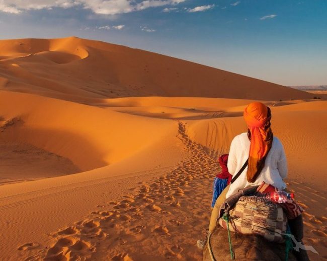 Fahrt durch die wunderschöne Oasenlandschaft, entlang verlassener Kasbahs und wilder Flussläufe. Halt an der historischen Karawanen-Oase von Rissani, bevor Sie Erfoud erreichen. Am Nachmittag haben Sie Gelegenheit, an einem ganz besonderen Wüstenerlebnis teilzunehmen. Fahrt zum großen Sandmeer „Erg Chebbi“ mit Wanderung in den riesigen Sanddünen. Ein unvergesslicher Sonnenuntergang wartet auf Sie (nicht inkl., buchbar vor Ort 35 €, Kamelritt in den Sanddünen gegen Aufpreis möglich).