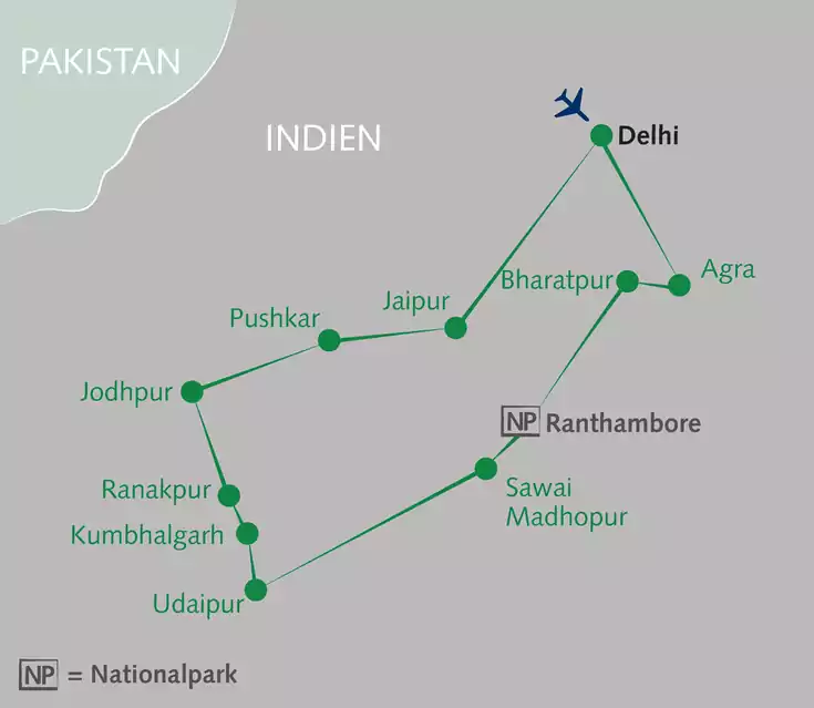 Quer durch Rajasthan jagt ein Highlight das nächste. Zu Fuß, per Rad und mit dem Allrad-Fahrzeug erleben wir zwei Nationalparks, abwechslungsreiche Landschaften und acht UNESCO-Weltkulturerbestätten. Auf den Spuren der Maharadschas erkunden wir Städte wie Jaipur, Udaipur und Agra. Während unserer Übernachtung in einem alten Palasthotel fühlen wir uns in alte und große Zeiten zurückversetzt. Der Duft auf den Märkten und Basaren verwöhnt unsere Sinne. Erlebe die Höhepunkte Rajasthans hautnah!