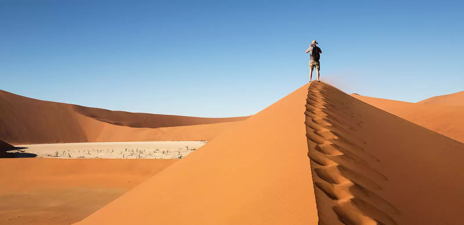 Wir erreichen die älteste Wüste der Welt – die Namib. Unendliche Weiten, bizarr geformte Dünen und leuchtende Farben erwarten uns. Am Nachmittag erleben wir auf einer Nature Drive die Faszination dieser Landschaft mit ihren versteinerten Dünen und seltenen Pflanzen. Früh am nächsten Morgen fahren wir ins Herz der Namib: zum Sossusvlei. Dort wandern wir durch das leuchtend orange Dünenmeer und genießen spektakuläre Ausblicke von den Dünenkämmen. GZ 3 Std. Wir können dorthin wandern (GZ ca. 2 Std) oder fakultativ dem Shuttle fahren. Die bekanntesten Fotomotive Namibias – darunter das berühmte „Deadvlei“ – erwarten uns. 2 Lodgeübernachtung. 200 km und 250 km. (2 x F, 1 x M, 2 x A)