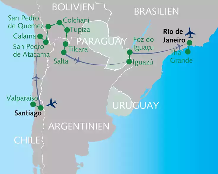 Südamerika steht für Vielfalt – und genau das zeigt unsere Reise vom Pazifik zum Atlantik durch vier Länder. Wir erleben die Extreme des Kontinents: die Atacama-Wüste in Chile, den endlosen Salar de Uyuni in Bolivien, farbenprächtige Felsen im Norden Argentiniens, die gewaltigen Iguazú-Fälle und zum Abschluss brasilianische Leidenschaft in Rio. Diese Reise wird dich tief beeindrucken und garantiert unvergessen bleiben!