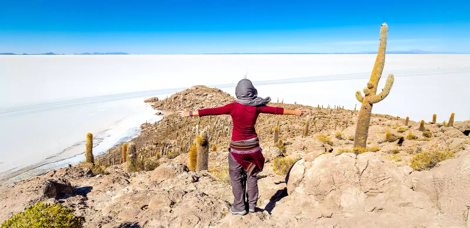 Heute erwartet uns der scheinbar endlose Salar de Uyuni – eine schimmernde Salzfläche, die mit dem Himmel verschmilzt. Auf der Insel Incahuasi spazieren wir zwischen meterhohen Kakteen durch eine bizarre Landschaft. Am Fuß des Vulkans Tunupa wandern wir anschließend zu einem Aussichtspunkt, der den Blick über das weite Salzmeer freigibt. GZ ca. 2 Std., ± 150 m. Hotelübernachtung in Colchani. 260 km. (F, M)
