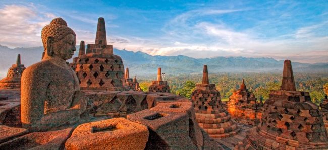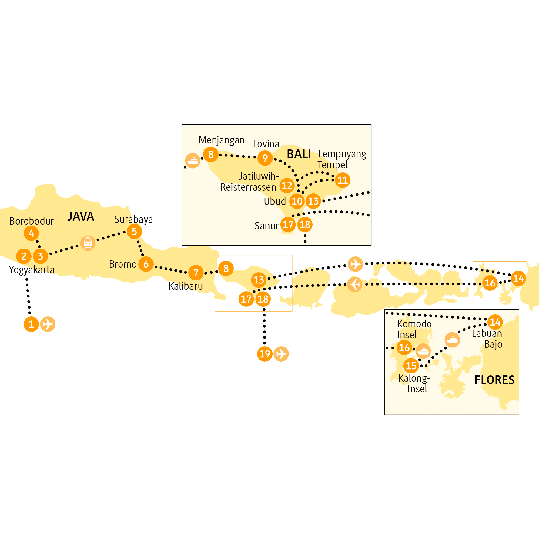 Die 17.000 Inseln Indonesiens werden wir nicht ganz schaffen. Aber pinkfarbene Strände und berühmte Urzeitechsen wirst du sehen, wenn wir drei Tage auf einem Luxussegelboot durch die Floressee schippern. Staunend beobachtest du, wie die ersten Sonnenstrahlen die Stupas des größten buddhistischen Tempels der Welt in orangefarbenes Licht tauchen. Erinnerungen für immer, wie auch die grünen Wunderlandschaften der Kaffee-, Kakao- und Gewürzplantagen auf Bali oder der Mount Bromo, naturspektakelnder Sitz der Götter.