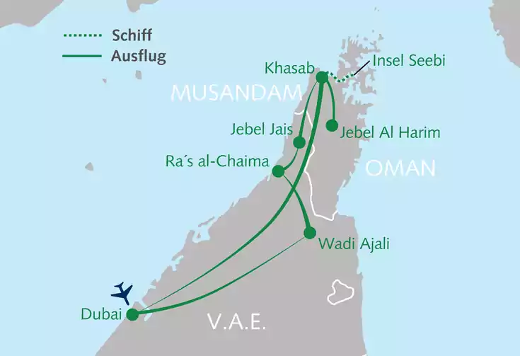 Einst für unmöglich gehalten, heute in aller Munde: Dubai, die Metropole auf Wüstensand mit Wolkenkratzern so weit das Auge reicht. Aber wie sieht es jenseits der Skyline aus? Nur Ölfelder und gähnende Leere? Von wegen! Im Norden der Vereinigten Arabischen Emirate und in der angrenzenden omanischen Provinz Musandam erwarten dich spektakuläre Naturkulissen – von den Gipfeln des Hajar-Gebirges, über Wadis und Oasen bis zum kristallklaren Wasser der Fjorde. Nicht umsonst nennt man Musandam auch das „Norwegen Arabiens“. Kommt mit und entdecke zwei Länder des Orients aus einer ganz neuen Perspektive!