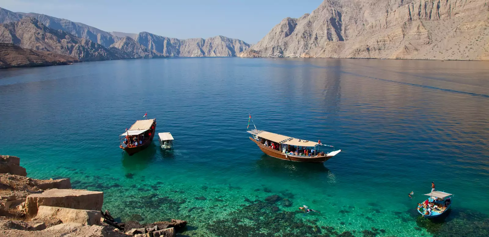 Leinen los! Heute steht uns eine Dhow, ein traditionelles omanisches Boot, exklusiv zur Verfügung für eine ganztägige Fahrt durch Meeresarme, die von schroffen Bergen umringt sind – willkommen in der arabischen Fjordlandschaft. Von menschlichen Siedlungen fehlt schnell jede Spur. Dafür lohnt es sich, Ausschau nach geselligen Meeresbewohnern zu halten. Die Chance, Delfine zu sehen, ist hier ziemlich hoch. Im kristallklaren Wasser können wir schwimmen, schnorcheln und Kajak fahren (Kajaks an Bord inklusive). Wir machen Halt auf Telegraph Island, wo noch Relikte einer Telegraphenstation aus dem 19. Jahrhundert zu finden sind, und unternehmen auf der kleinen Insel Seebi eine kurze Wanderung zu einem Aussichtspunkt. GZ ca. 1 Stunde. (F, M)