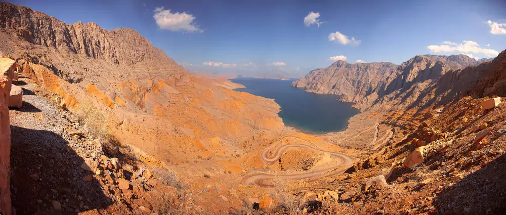 Wie ein Halbmond zieht sich das Hajar-Gebirge vom Osten Omans über die VAE bis nach Musandam und prägt enorm das Erscheinungsbild der kleinen Halbinsel. In Geländefahrzeugen machen wir uns auf zu den schönsten Ecken dieser zerklüfteten Landschaft. Vom Aussichtspunkt Khor Najd genießen wir einen beeindruckenden Panoramablick auf das Arabische Meer. Bergflanken ragen hier von beiden Seiten aus dem Wasser. Am Wadi Ain unternehmen wir eine erste Wanderung, die uns an Felsformationen vorbei zu einem Wasserfall führt. GZ ca. 2 Stunden. Schließlich fahren wir hoch zum fruchtbaren Sayh-Plateau und nähern uns dem Gipfel des Jebel Al Harim, dem höchsten Berg in Musandam. Unterwegs halten wir Ausschau nach versteinerten Fossilien, die bis zu 250 Millionen Jahre alt sind. 120 km. (F, M)