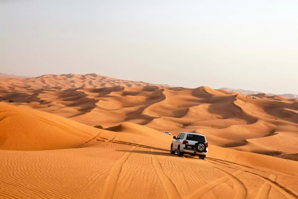Im Osten der VAE, an der Grenze der Emirate Ra’s al-Chaima und Fujairah, beginnt unsere letzte Wanderung am Wadi Ajali. Wadi bedeutet auf Arabisch so viel wie „Flusstal“, wobei der eigentliche Fluss auf unserem Weg zwischen hohen Felswänden fast nie über ein Rinnsal hinauswächst. Dafür tauchen links und rechts immer wieder kleine natürliche Wasserbecken auf, die zu einem erfrischenden Bad einladen. GZ ca. 2-3 Stunden. Bevor wir wieder in unserem Hotel in Dubai einkehren, darf aber natürlich noch ein Abstecher in die Wüste nicht fehlen. In Geländefahrzeugen durchqueren wir abends die roten Dünen östlich der Metropole und genießen den Sonnenuntergang in diesem endlos wirkenden Meer aus Sand. 1 Hotelübernachtung in Dubai. 178 km. (F, A)