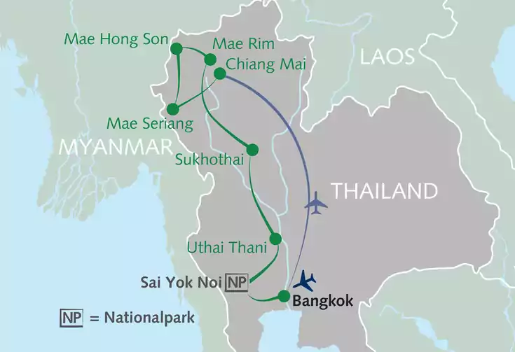 Sanfte Berggipfel, die sich majestätisch aus smaragdgrünen Tälern erheben, geheimnisvolle Nebelwälder und Flüsse, die sich durch wilde Schluchten schlängeln – willkommen im magischen Norden Thailands! Hier erwartet uns ein Paradies aus üppiger Natur, uralten Tempeln und lebendigen Traditionen, das die Herzen aller Asienreisenden höherschlagen lässt. Wir erkunden den dichten Dschungel zu Fuß und mit dem Boot. In idyllischen Bergdörfern tauchen wir ein in den Kulturraum der vielfältigen, hier ansässigen Bergstämme. Auf dem Fahrrad entdecken wir historische Königsstädte und genießen die faszinierenden Klänge der Bergwälder. Komm mit und erlebe die Magie Thailands hautnah!
