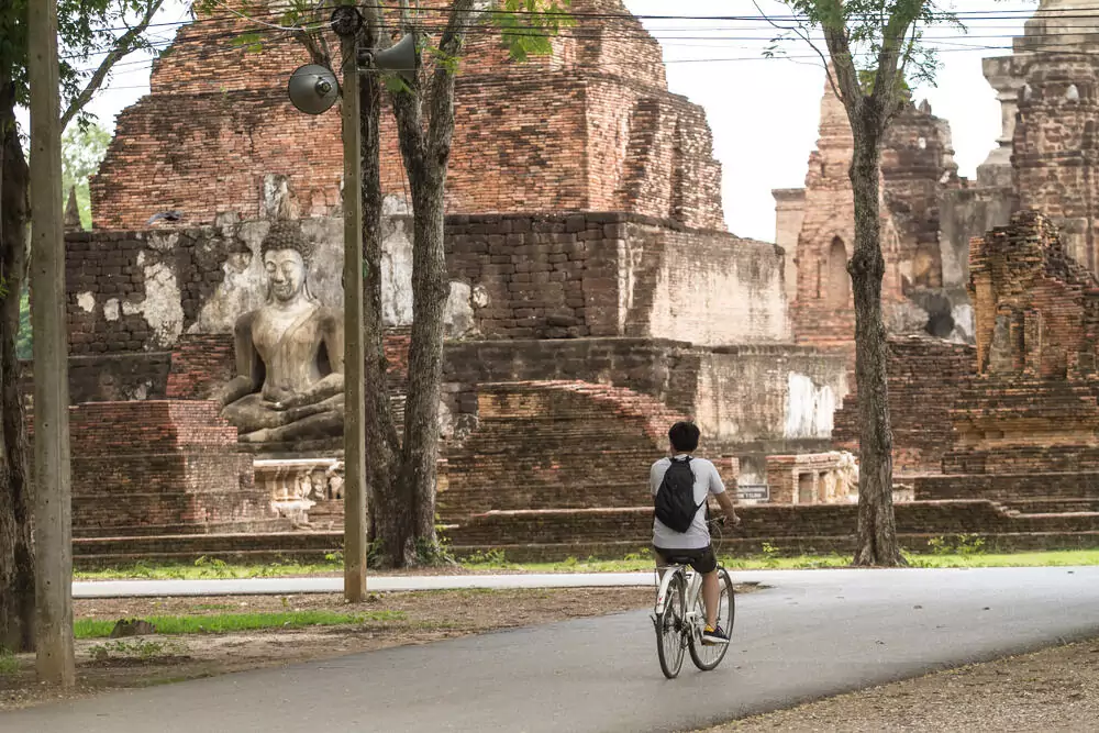 Fahrt von Mae Rim nach Sukhothai. Unterwegs besuchen wir den Tempel Wat Phra That Hariphunchai in Lamphun. Nach der Ankunft in Sukhothai machen wir einen Spaziergang zum Wat Chang Lom, einem Tempel, der idyllisch von Reisfeldern umgeben ist. Am nächsten Tag erkunden wir den Sukhothai Historical Park mit dem Fahrrad. FZ ca. 1 Std. Wir besichtigen die eindrucksvollen Tempelruinen und lassen uns ins alte Siam zurückversetzen. Wer möchte, verlängert die Radtour, um weitere Tempel außerhalb der Stadtmauern zu besuchen. FZ weitere 2 Std. 2 Hotelübernachtungen in Sukhothai. 380 km an Tag 9. (2 x F)